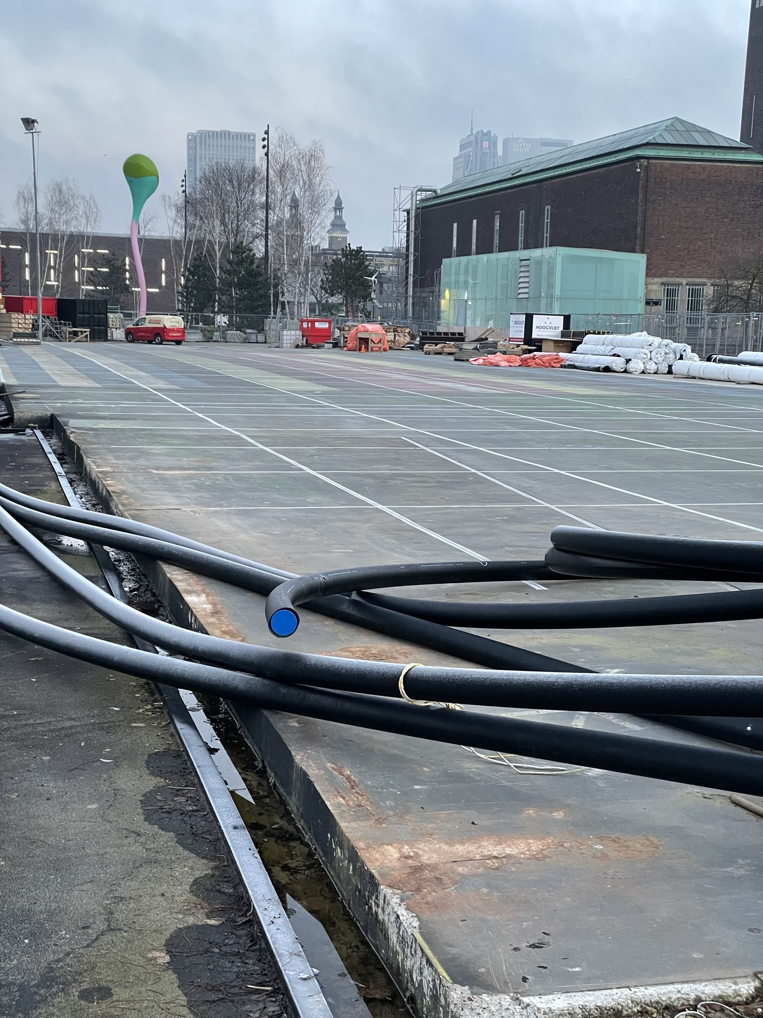 Nadat duidelijk was dat het aanbod voldeed is afgesproken dat de aannemer, die de museumparkplaten zou verwijderen, 26 blauwe en witte betonplaten zou loszagen en schoon leveren. Roelofs verzorgde het lossen, opslaan op de hub en leggen in het Milieupark.